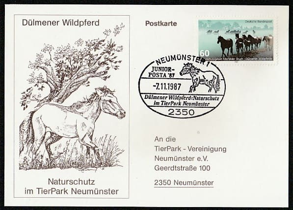 ПК ФРГ со спецгашением. Дюльменские дикие лошади в заповеднике, 07.11.1987 год, Ноймюнстер-1.