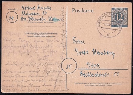 ПК Германии с маркой номиналом 12 пфеннигов, 1946 год, прошла почту