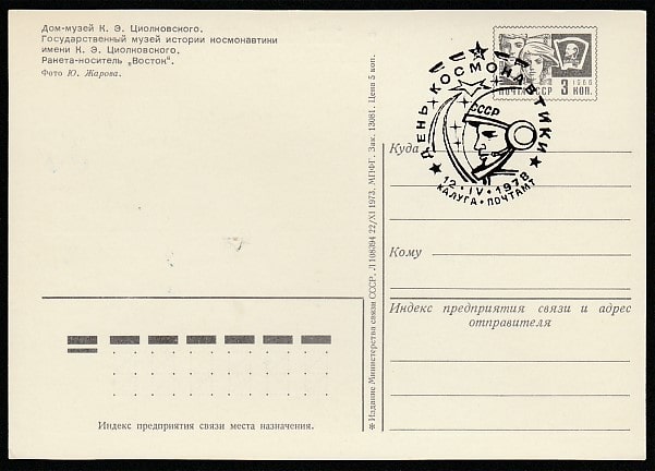 ПК. Калуга. Музей им. Циолковского 1973 год, СГ: День космонавтики, 12.04.1978 год, Калуга, почтамт.