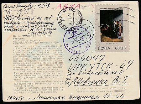 ПК. Картина П.А. Федотова "Вдовушка", 1963 год, гашение 1979 года, прошла почту