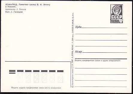 ПК Ленинград. Памятник-шалаш В.И. Ленину в Разливе. Выпуск 25.08.1986 год