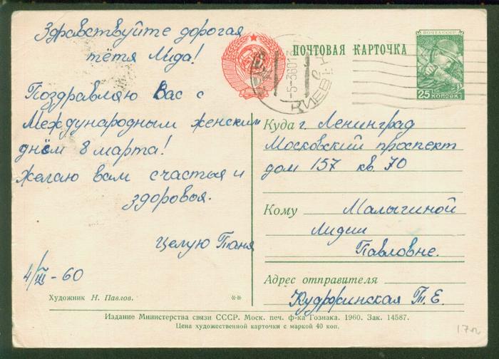 ПК Март 8. Международный женский день. Выпуск 1960 г. № 558