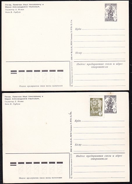 ПК Пенза. Памятник И.Н. и М.А. Ульяновым. Выпуск 8.01.1980 год, разновидность цвета