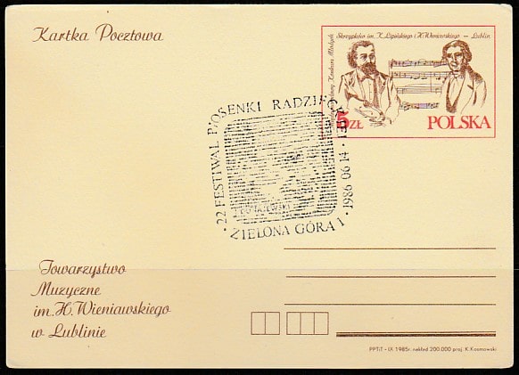 ПК Польши со спецгашением. Международный конкурс скрипачей имени Венявского, 14.06.1986 год, Зелёна-Гура