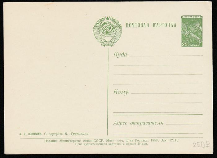 ПК А.С. Пушкин. С портрета В. Тропинина. Выпуск 1958 г. № 435