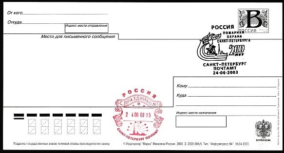 ПК с литерой "В". 200 лет пожарной охране Санкт-Петербурга, спецгашение 24.06.2003 год КШ: С Праздником, 24.06.2003 год, СПб, почтамт.