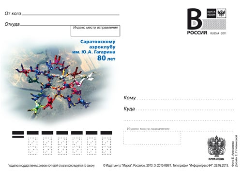 ПК с литерой "В" 2013 год. Саратовскому аэроклубу им. Ю.А. Гагарина 80 лет (Ю)
