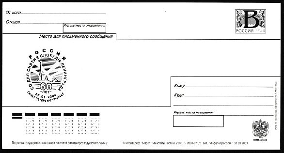 ПК с литерой "В". 300 лет Петербургу. Вид на собор Спас на Крови, 2003 год, спецгашение СГ: 60 лет со дня снятия блокады Ленинграда, 27.01.2004 год, СПб, почтамт.