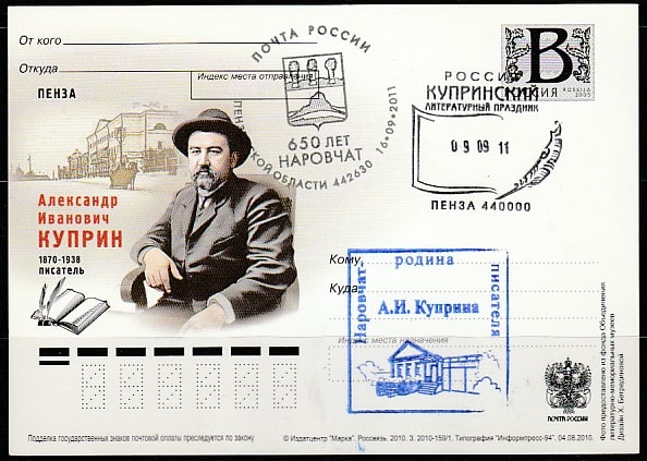 ПК с литерой "В" и СГ. Писатель А.И. Куприн, 2010 год. СГ: Купринский литературный праздник, 09.09.2011 год, Пенза. СГ: 650 лет городу Наровчат - родине Куприна, 16.09.2011 год, Наровчат Пензенской области.
