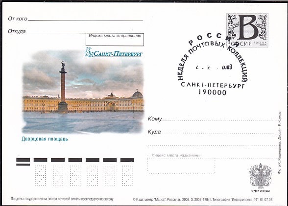 ПК с литерой В и спецгашением "Неделя почтовых марок", 28.06.2009 год, Санкт-Петербург (ВВ)