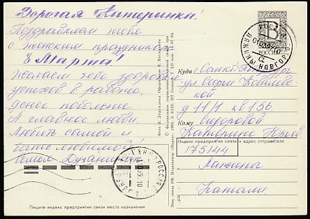 ПК с литерой "В". Поздравляем с праздником 8 Марта! 1995 год, прошла почту