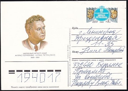 ПК с ОМ 100 лет со дня рождения Кипраса Петраускаса. Выпуск 25.04.1985 год, прошла почту