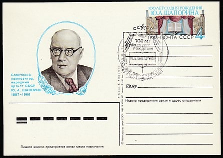ПК с ОМ. 100 лет со дня рождения композитора Ю.А. Шапорина, № 170, гашение ПД 08.11.1987 год, Москва, почтамт