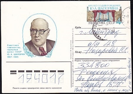 ПК с ОМ 100 лет со дня рождения Ю.А. Шапорина. Выпуск 3.04.1987 год, прошла почту