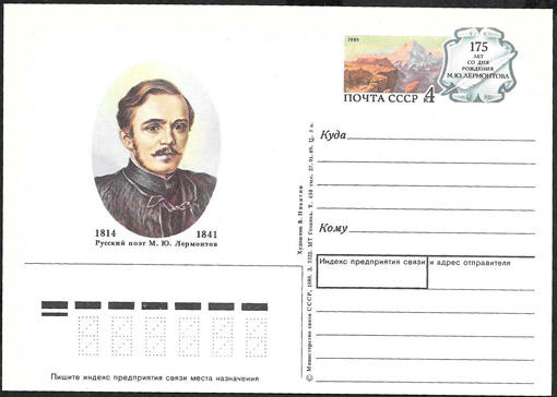 ПК с ОМ 175 лет со дня рождения М. Ю. Лермонтова 1989 год. № 193. поэт