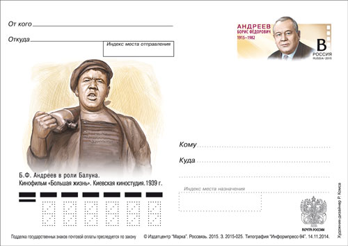 На почтовой карточке с оригинальной маркой изображены портрет актёра и фрагмент из кинофильма «Большая жизнь», где Андреев сыграл роль Харитона Балуна (Киевская киностудия, 1939).