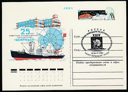 ПК с ОМ. 25 лет антарктической обсерватории "Мирный", № 91, спецгашение: XXIV Совещание по договору об антарктике, 09-20.07.2001 год, СПб