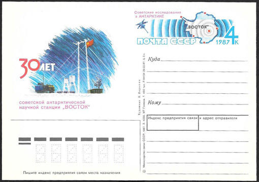 ПК с ОМ 30 лет советской антарктической станции "Восток" 1987 год. № 172. космос ( 1Ю)
