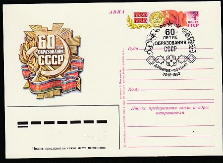 ПК с ОМ. 60 лет образования СССР, № 110, спецгашение, 30.12.1982 год, Душанбе, почтамт
