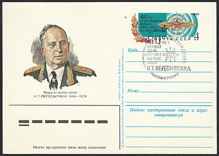 ПК с ОМ. 80 лет со дня рождения маршала войск связи И.Т. Пересыпкина, № 124, гашение первого дня 18.06.1984 год, Москва, почтамт
