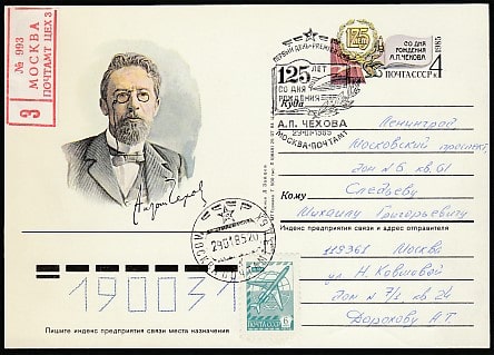 ПК с ОМ и гашением ПД. 125 лет со дня рождения А.П. Чехова, 29.01.1985 год, Москва, почтамт, прошла почту