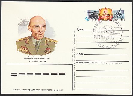 ПК с ОМ и гашением ПД. 80 лет со дня рождения конструктора танков А.А. Морозова, 29.10.1984 год, Москва, почтамт