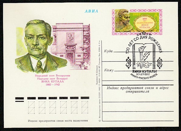 ПК с ОМ и СГ. 100 лет со дня рождения Янки Купалы, 07.07.1982 год, Минск, почтамт.