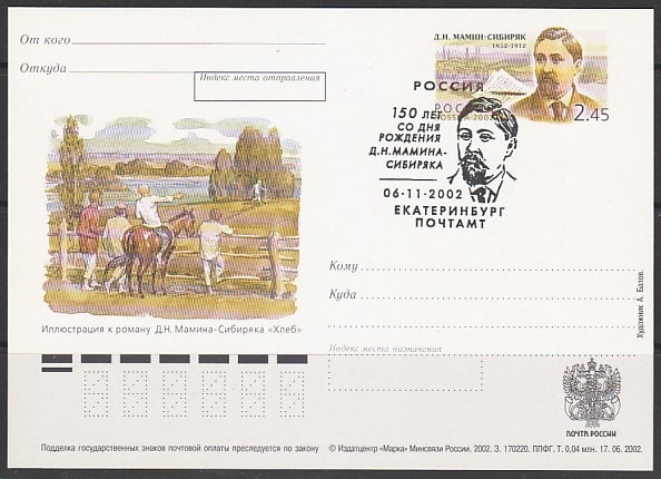 ПК с ОМ и СГ. 150 лет со дня рождения писателя Д.Н. Мамина-Сибиряка. 2002 г. № 127. СГ: 06.11.2002 год, Екатеринбург, почтамт.