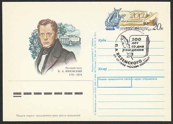 ПК с ОМ и СГ. 200 лет со дня рождения П.А. Вяземского, 23.07.1992 год, Москва, почтамт (№ 3)