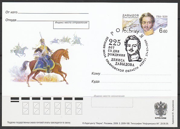 ПК с ОМ и СГ. 225 лет со дня рождения писателя и поэта Д.В. Давыдова, 2009 год, № 196.