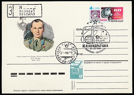 ПК с ОМ и СГ. 90 лет со дня рождения основоположника космонавтики Ю.В. Кондратюка, 21.06.1987 год, Полтава, почтамт (+1Ю)