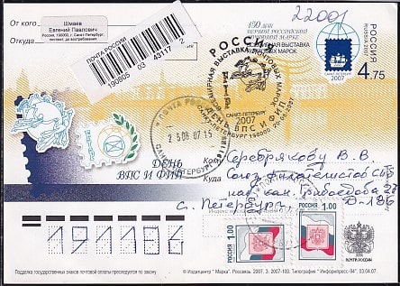 ПК с ОМ и СГ "Всемирная выставка почтовых марок "День ВПС и ФИП", 2007 год, Санкт-Петербург, прошел почту (№ 173