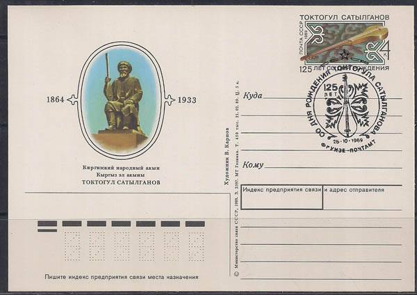 ПК с ОМ и спецгашением. 125 лет со дня рождения киргизского народного акына Т. Сатылганова, 25.10.1989 год, Фрунзе почтамт (Ю)