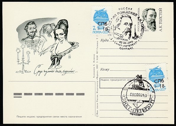 ПК с ОМ и спецгашением. 175 лет со дня рождения А.К. Толстого, 05.09.1992 год, СПб, почтамт (штемпель гашения) (II)