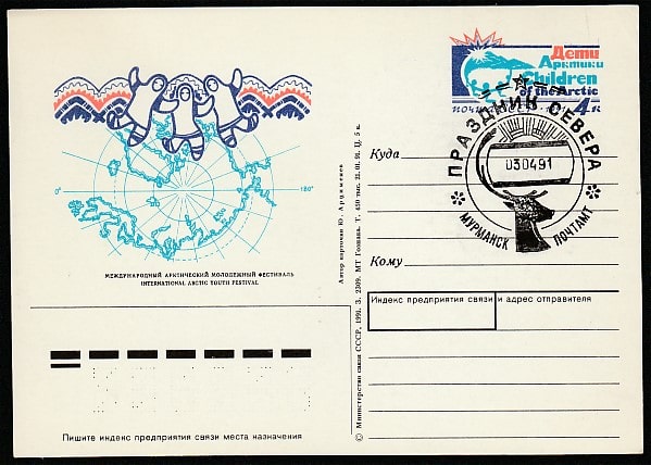 ПК с ОМ. Международный фестиваль "Дети Арктики", спецгашение 03.04.1991 год, Мурманск, почтамт (№ 222)