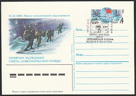 ПК с ОМ. Полярная экспедиция газеты "Комсомольская Правда", № 160, гашение ПД 18.12.1986 год, Москва, почтамт