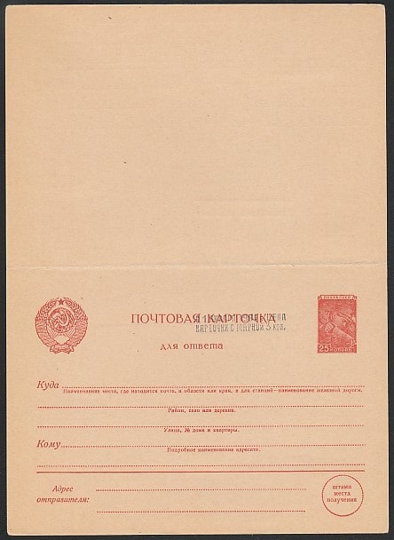 ПК с оплаченным ответом. Марка ном. 25 к. + 25 к. (шахтёр), переоценка 1961 год