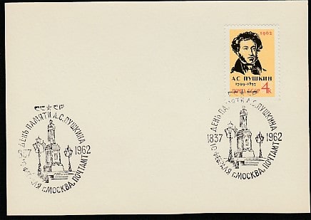 ПК со спецгашением. День памяти А.С. Пушкина, 10.02.1962 год, Москва, почтамт