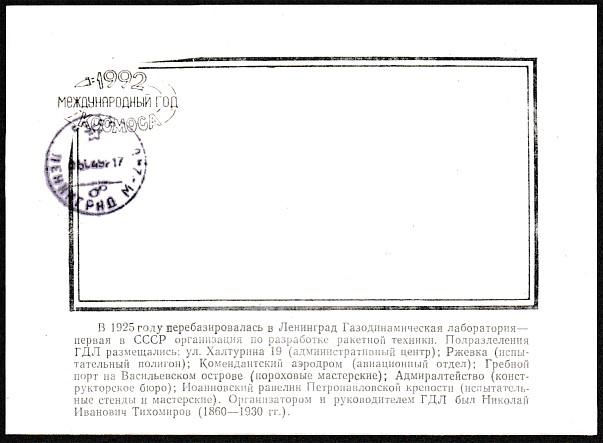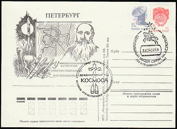 ПК со спецгашением. Международный год космоса. Центральный музей связи имени А.С. Попова, 12.04.1992 год, Санкт-Петербург (Ю)