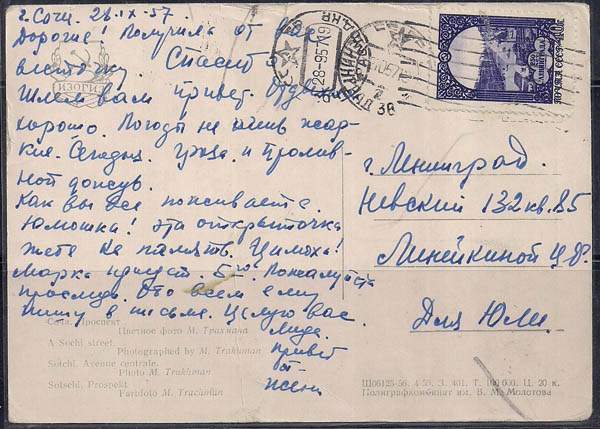 ПК. Сочи. Проспект (фото М. Трахмана), 1956 год, прошла почту