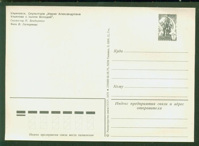 ПК Ульяновск. Скульптура "М.А. Ульянова с сыном Володей". Выпуск 02.02.79 г. № 84