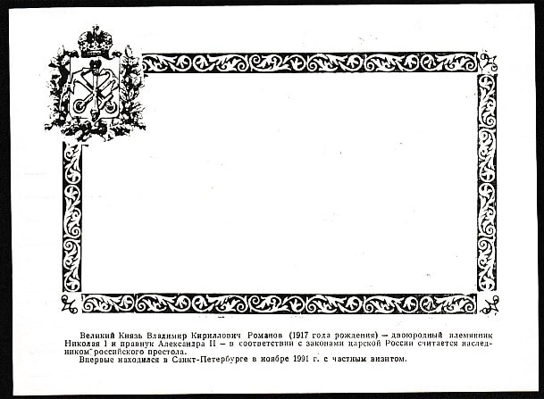 ПК. Великий князь В.К. Романов, штемпель гашения, 1991 год. МГП "Филателия". Тир. 500 экз.