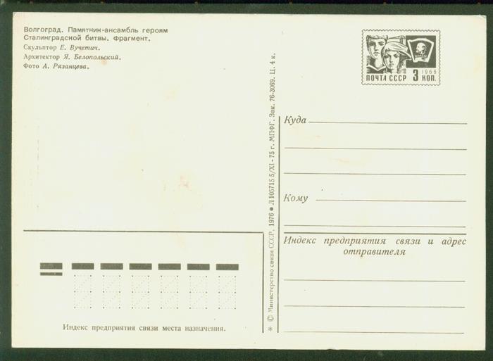 ПК Волгоград. Скульптура "Родина-мать". Выпуск 05.11.1975 г. № 4718