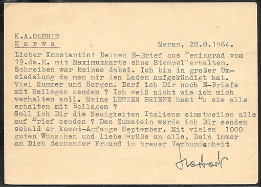 ПК Заказная почта 1964 год. Италия- СССР, Нарва