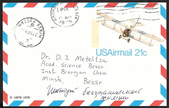Почтовая карточка Авиа США, прошла почту Сакраменто - Минск 1978 год