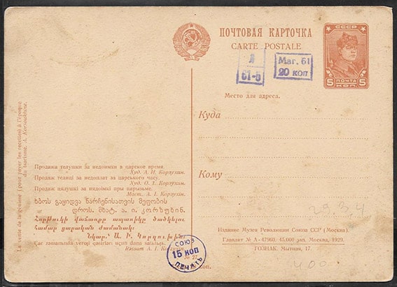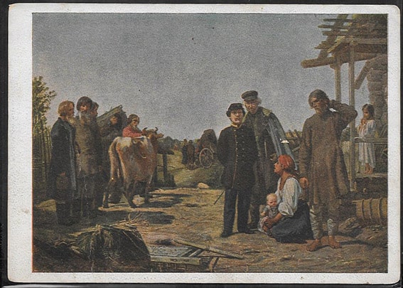 Почтовая карточка. Худ. А.И. Корзухин. Продажа телушки за недоимки в царское время, 1929 год
