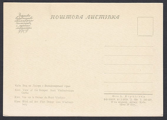 Почтовая карточка. Киев. Вид на Днепр с Владимирской горки, 1959 год