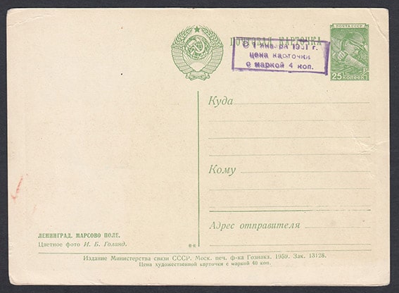Почтовая карточка. Ленинград. Марсово поле, 1959 год. Переоценка 1961 год