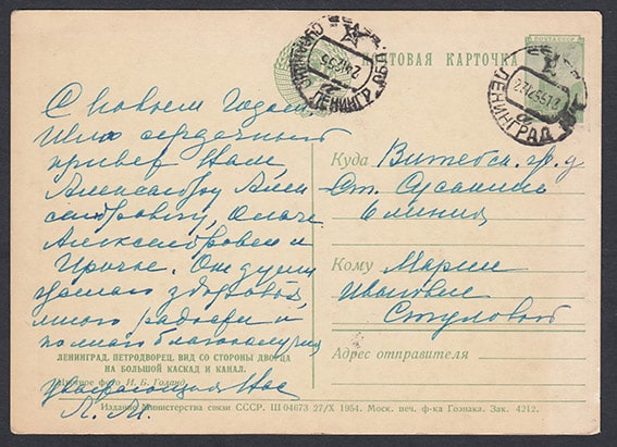Почтовая карточка. Ленинград. Петродворец. Вид со стороны дворца на большой каскад и канал, 1954 год