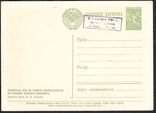 Почтовая карточка Ленинград. Вид на башню Адмиралтейства 1959 г. № 418 (Кат. В. и А. Ивашкины)